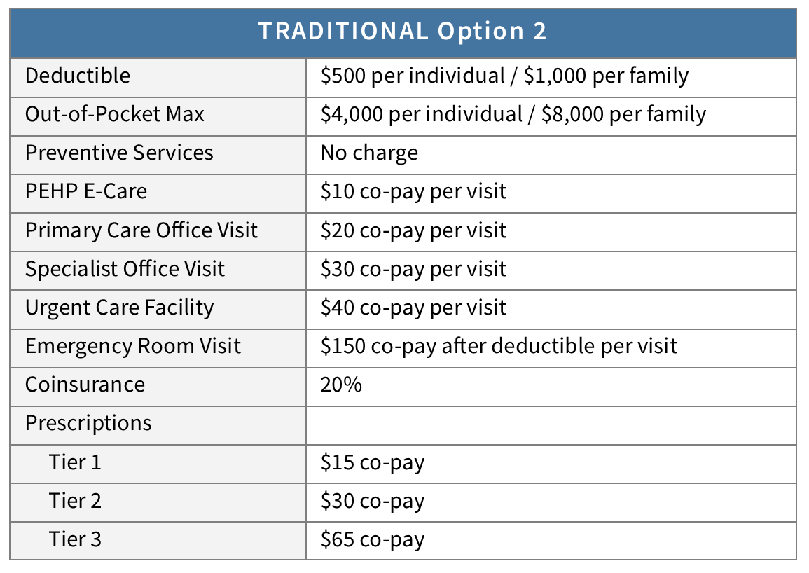 The Traditional plan offers fixed copays for many services like doctor visits and prescription drugs.